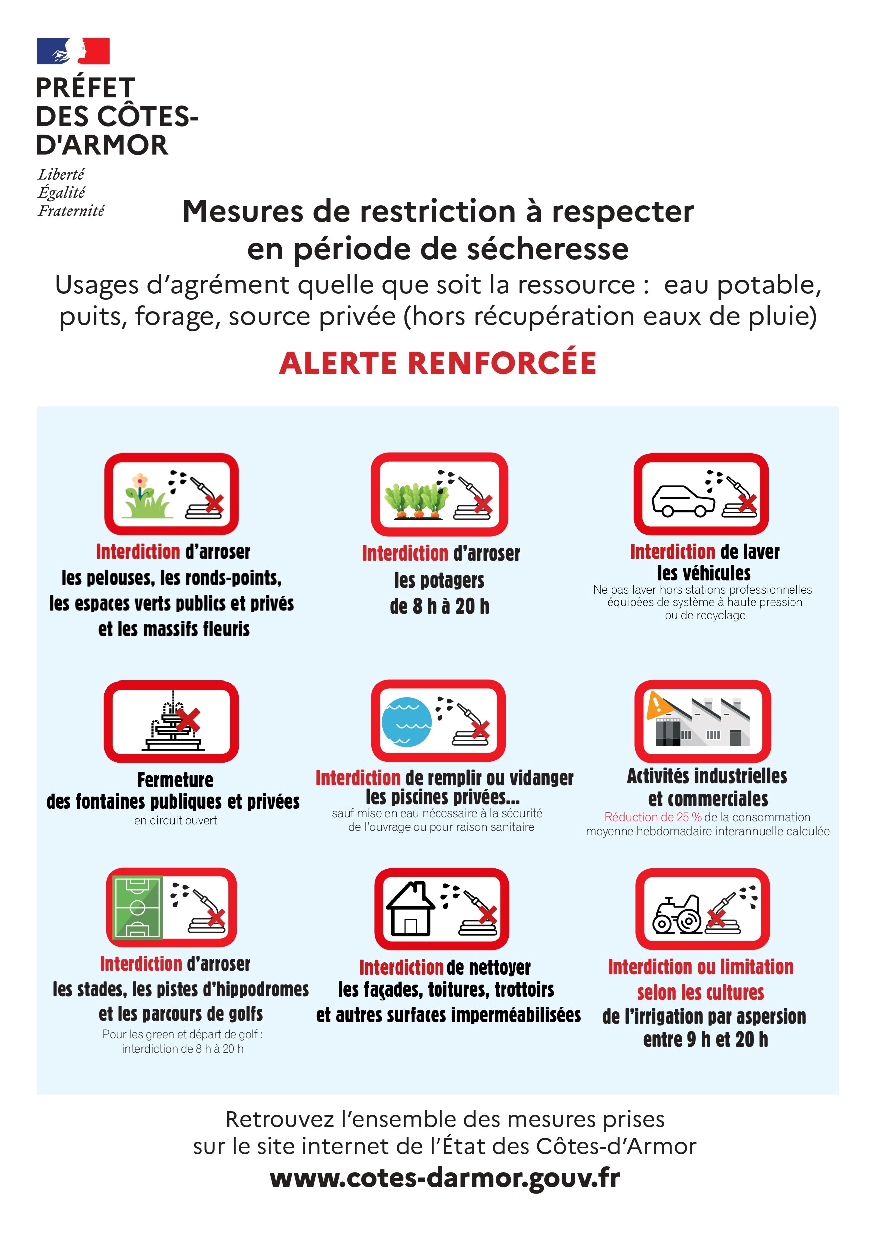 Par arrêté préfectoral en date du 28 juillet 2022, les zones SUD et EST du département des Côtes-d'Armor ont été placées en "alerte sécheresse renforcée".