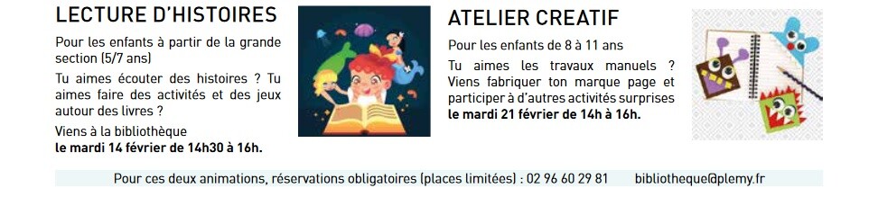 - 14 février : lectures d'histoires et activités autour des livres pour les 5/7 ans