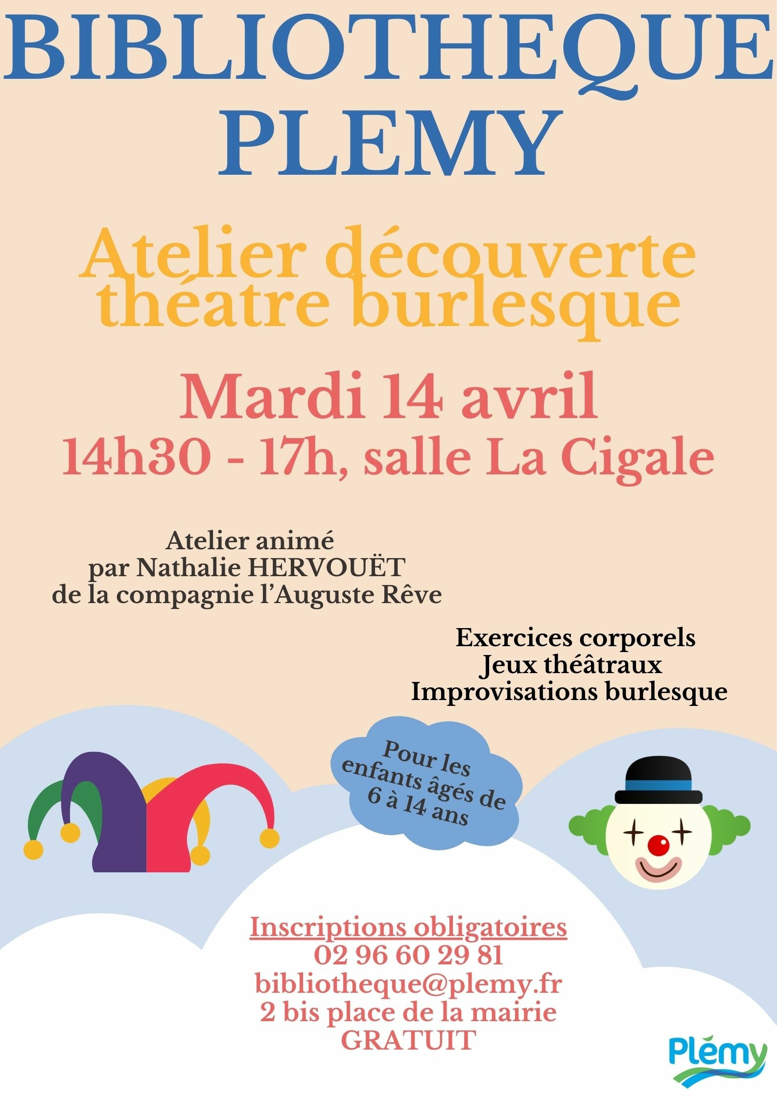 Inscriptions obligatoires auprès de la bibliothèque : Sur place, par mail : bibliotheque@plemy.fr, par téléphone : 02 96 60 29 81