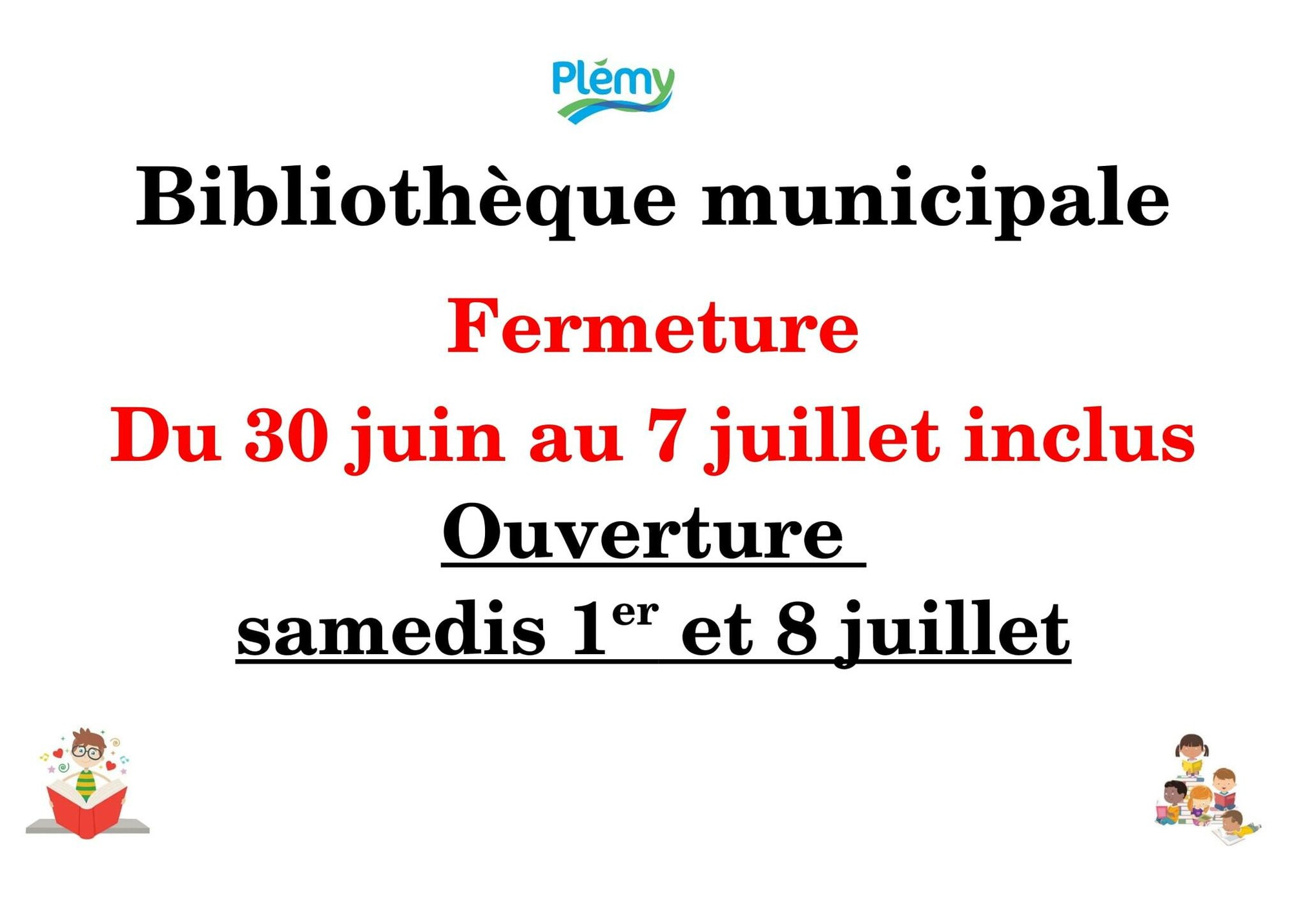 La bibliothèque sera fermée du vendredi 30 juin au vendredi 7 juillet inclus. Ouverture les samedis 1er et 8 juillet.