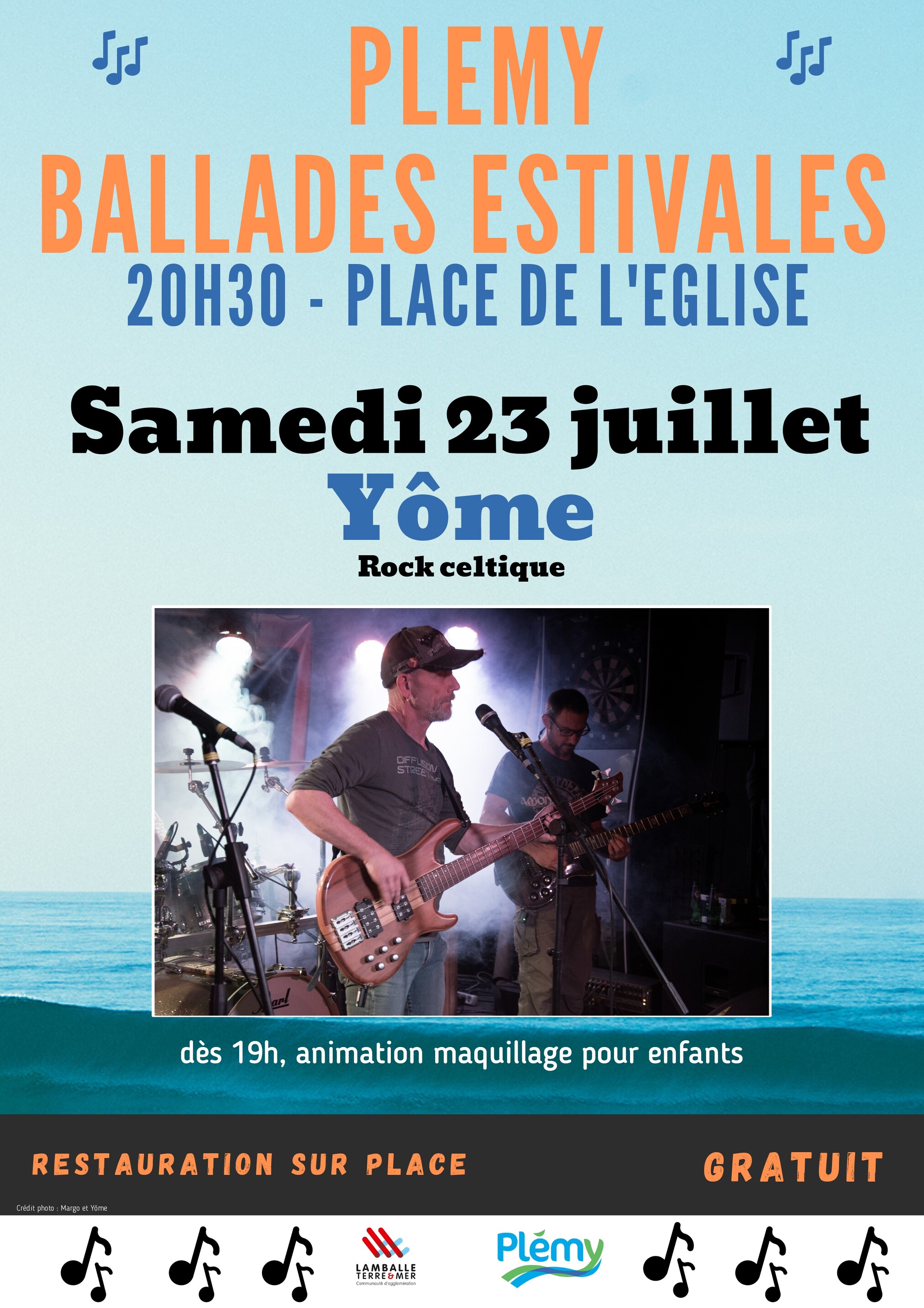 Pour la troisième année consécutive, la mairie organise des concerts place de l’Eglise durant les mois d’été. Première date le 23 juillet avec Yôme groupe de rock celtique à 20h30. Ces cinq musiciens d’expérience animeront la place avec des mélodies entraînantes à la bombarde, à la guitare, à la batterie… des textes en français, des refrains accrocheurs… Dès 19h, maquillage pour enfants avec le clown Luigi et petite restauration sur place (galettes saucisses) Animations et concert gratuits