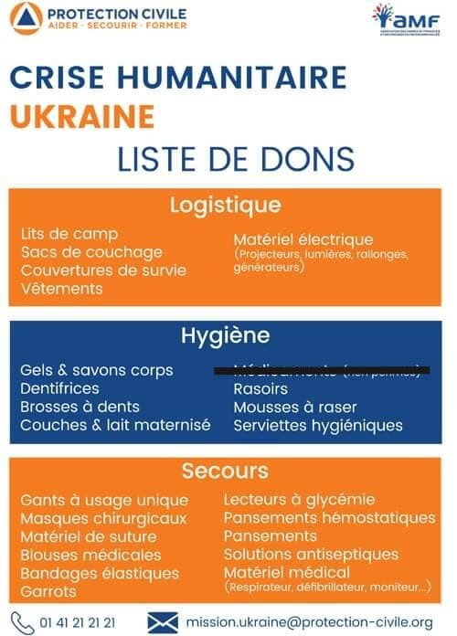 La commune a décidé de s'associer à l'appel lancé par l’Association des Maires de France pour venir en aide au peuple ukrainien. Elle organise une collecte de produits d'hygiène et de petits matériels médicales: gels, savons, brosses à dents, dentifrice, couches et lait maternisé, rasoirs, mousses à raser, serviettes hygiéniques, gants à usage unique, masques chirurgicaux, pansements, couvertures de survie, piles…) Ces produits seront remis à l’antenne départementale de la protection civile qui se chargera de l'acheminement jusqu'à la frontière polonaise. Ils seront ensuite remis aux autorités ukrainiennes. Les membres du CCAS assureront des permanences pour recueillir les dons de 9h à 12h et de 14h à 17h, samedi 12 mars, à la mairie, salle du conseil municipal.